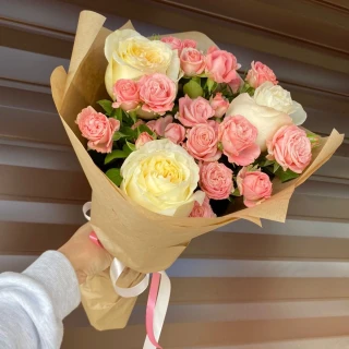 "Вайт энд роуз" - восхитительный букет цветов из кустовых и одноголовых роз в нежных тонах пронизан нежностью и романтикой. Каждый цветок в этой композиции является символом любви и нежности, создавая атмосферу тепла и умиротворения. Крафтовая упаковка придает букету особую элегантность и неповторимый шарм. Это идеальный подарок для тех, кто хочет выразить свои глубокие чувства и создать незабываемый момент для своих близких или любимых людей.