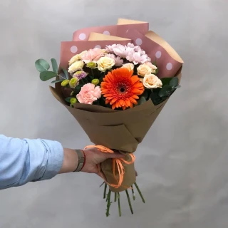 Погрузитесь в мир волшебства и красоты с букетом "Волшебство ароматов". Этот уникальный букет составлен из нежных кустовых роз, изящных хризантем, ярких гербер и изысканных гвоздик. Каждый цветок в нем – подобно светящейся звезде в бескрайнем небе. Тонко украшенные зеленью, цветы создают завораживающую композицию, словно произведение искусства. А крафтовая упаковка придает букету естественный и стильный вид.